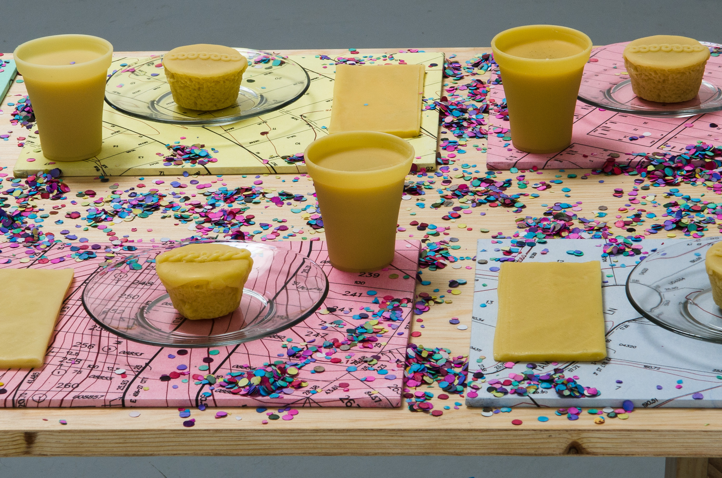 In ‘Freedom of Choice’, abstracted, child-sized wooden picnic tables are neatly lined with placemats. The pastel-tinted placemats, printed with fragments of subdivision layouts, hold nearly identical snacks. Squiggle topped cupcakes, a food icon, are cast in golden beeswax, along with drinks in styrofoam cups and folded paper napkins. Pretty and appealing at first sight, they hint at a numbing reality. This classic snack gives off a faint scent of honey and a translucent glow, and, like the real thing, has no nutritional value.